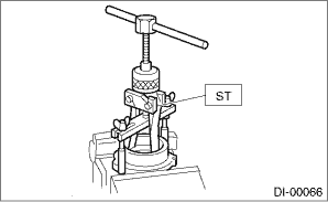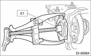 10. Using the ST, remove the bearing cone. NOTE: • Do not attempt to disassemble the parts unless necessary. • Set the ST so that its claws catch the edge of the bearing cone. • Never mix up the RH and LH bearing races and cones.