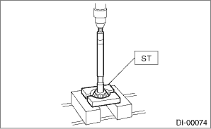 16. Press the end of drive pinion shaft using ST and remove the rear bearing cone, preload adjusting spacer and washer. NOTE: Hold the drive pinion so as not to drop it.
