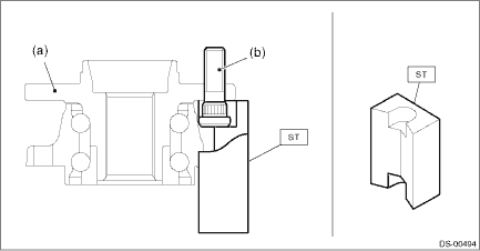 Using the ST or a hydraulic press, push out the bolt - hub (b) from the hub unit COMPL - front axle (a). CAUTION: • Be careful not to hammer the bolts - hub. This may deform the hub unit COMPL. • Do not reuse the bolt - hub. NOTE: Since the hub unit COMPL can not be disassembled, only bolts - hub can be removed. Preparation tool: ST: HUB STAND (28399AG000)