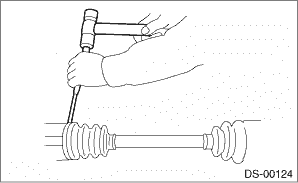 7. To remove the cage from inner race, turn the cage by a half pitch to the track groove of inner race and shift the cage. 8. Using pliers, remove the snap ring fixing the inner race to the shaft. 9. Take out the DOJ inner race. 10. Take off the DOJ cage from shaft and remove the DOJ boot. CAUTION: Wrap shaft splines with vinyl tape to protect the boot from scratches. 11. Remove the BJ boot or EBJ boot in the same procedure as the DOJ boot. NOTE: Further disassembly of the drive shaft is impossible because the BJ and EBJ cannot be disassembled. |