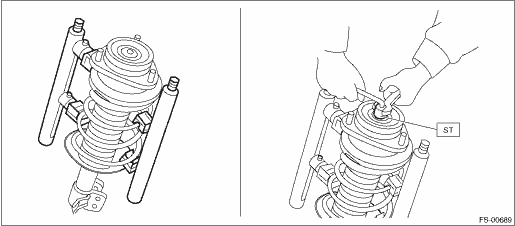 1. Using a coil spring compressor, compress the coil spring. 2. Using a hexagon wrench to prevent strut rod from turning, remove the self-locking nut with ST. CAUTION: When installing the coil spring compressor to the coil spring, follow the operation manual accompanied with the coil spring compressor during operation. Preparation tool: ST: STRUT MOUNT SOCKET (20399AG000) NOTE: The installing position of coil spring compressor varies depending on the coil spring shape and winding number.