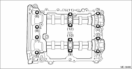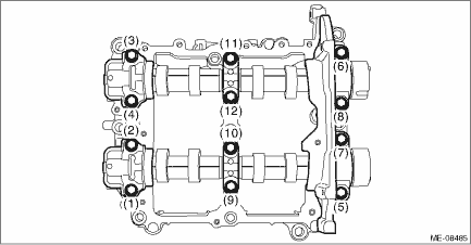 1. CAM CARRIER RH 1. Loosen the bolts (front camshaft cap RH, intake center camshaft cap RH, intake rear camshaft cap RH, exhaust center camshaft cap RH, and exhaust rear camshaft cap RH) equally, a little at a time in numerical sequence as shown in the figure, and remove each camshaft cap. NOTE: Arrange camshaft caps in order so that they can be installed in their original positions.