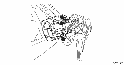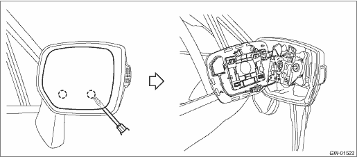 CAUTION: • When removing the mirror - repair, be careful not to damage the back surface of mirror - repair with a flat tip screwdriver. • When removing the mirror - repair, insert the connector and clip securely. 1. Operate the remote control mirror switch to face the mirror - repair upward. 2. Disconnect the ground terminal from the battery sensor, and wait for at least 60 seconds before starting work. NOTE 3. Remove the mirror - repair. (1) Using a flat tip screwdriver or similar tool, release the engagement shown in the figure, and slide the mirror - repair downward to remove.