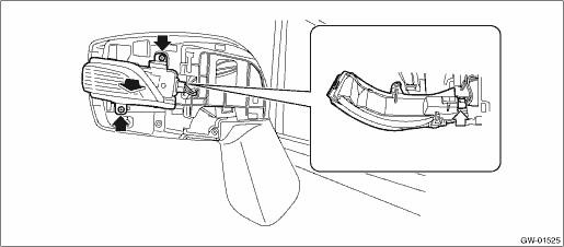 6. Remove the light assembly - side turn mirror. (Model with side turn signal light) (1) Remove the screws and pull out the light assembly - side turn mirror to the front of the vehicle. (2) Disconnect the connector and remove the light assembly - side turn mirror.