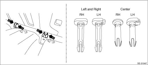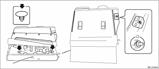 1. Remove the rear seat. Rear Seat > REMOVAL 2. Remove the headrest assembly - rear. 3. Remove the resin fasteners on the lower of the backrest assembly, and remove the clip. 4. Release the clips to remove the lock cover. (OUTBACK model) 5. Open the fastener and turn over the cover COMPL - rear backrest.