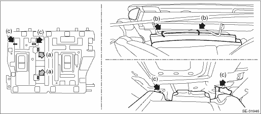 NOTE: The armrests cannot be detached while the backrest assembly RH and armrest side pin positions are not aligned. 8. Remove the wire clamp (a) and the hog rings (b) and (c).