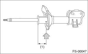 CAUTION: • Before handling the strut damper and shock absorber, be sure to wear goggles to protect eyes from gas, oil and cutting powder. • Do not disassemble the strut damper and shock absorber or place them into a fire. • When discarding gas filled strut dampers and shock absorbers, drill holes in them to purge the gas. 1. Place the strut damper and shock absorber on a level surface with the piston rod fully expanded. 2. Make a hole into the specified position 30 mm (1.18 in) deep using a drill with 2 — 3 mm (0.08 — 0.12 in) diameter.