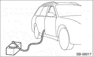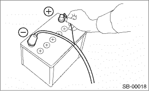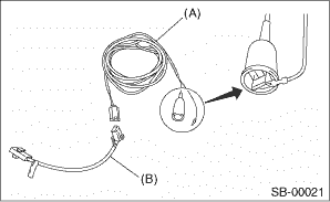6. Short the alligator clip and terminal of the airbag deployment tool together. CAUTION: Short the airbag deployment tool terminals until just before the pretensioner operation process. Preparation tool: ST: AIRBAG DEPLOYMENT TOOL (98299PA030) 7. Connect the airbag deployment tool (A) and test harness adapter D (B). Preparation tool: ST: TEST HARNESS ADAPTER D (98299SA010)