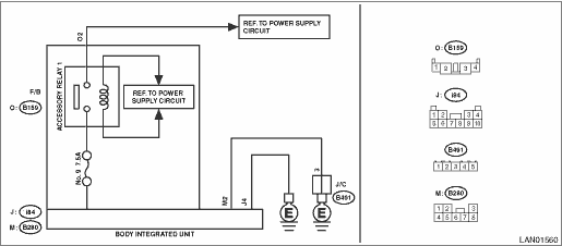 4.CHECK HARNESS. 1) Turn the ignition switch to ACC. 2) Using the tester, measure the voltage between terminals. Connector & terminal F/B fuse No. 9 (+) — Chassis ground (−): | Is the voltage 8.5 — 16.5 V- | Replace the body integrated unit. Body Integrated Unit | Diagnostic Procedure with Diagnostic Trouble Code (DTC) > DTC B1014 ACC POWER |