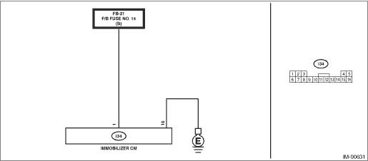 6.CHECK IMMOBILIZER CM GROUND CIRCUIT. Measure the resistance between immobilizer CM connector and chassis ground. Connector & terminal (i34) No. 16 — Chassis ground: | Is the resistance less than 10 -- | Replace the immobilizer CM. Immobilizer Control Module | Repair the open circuit of harness between the immobilizer CM connector and chassis ground. |