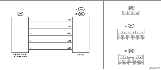 4.CHECK HARNESS (OPEN CIRCUIT). 1) Disconnect the connector from A/C CM. 2) Using a tester, check continuity between terminals. Connector & terminal (i174) No. 5 — (i80) No. 17: (i174) No. 1 — (i80) No. 12: (i174) No. 3 — (i181) No. 18: (i174) No. 6 — (i181) No. 21: (i174) No. 7 — (i181) No. 11: | | Diagnostic Procedure with Diagnostic Trouble Code (DTC) > DTC B1446 AIR MIX DOOR ACTUATOR CIRCUIT STUCK (DRIVER) | Repair or replace the open circuit of harness. |