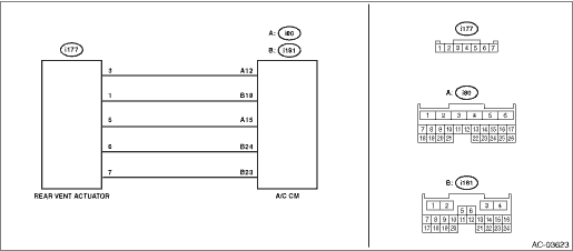 4.CHECK HARNESS (OPEN CIRCUIT). Using a tester, check continuity between terminals. Connector & terminal (i177) No. 3 — (i80) No. 12: (i177) No. 1 — (i181) No. 18: (i177) No. 5 — (i80) No. 15: | | Replace the A/C CM. Control Unit > REMOVAL | Repair or replace the open circuit of harness. |