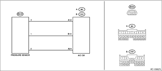 2.CHECK PRESSURE SENSOR. 1) Disconnect the refrigerant pressure sensor. 2) Short No. 1 and No. 2 of B505 connector. 3) Read the DTC of the A/C CM using the Subaru Select Monitor. Read Diagnostic Trouble Code (DTC) | | Replace the refrigerant pressure sensor. Hose and Pipe > REMOVAL | Diagnostic Procedure with Diagnostic Trouble Code (DTC) > DTC B14A3 REFRIGERANT PRESSURE SENSOR CIRCUIT OPEN |