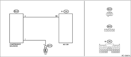 4.CHECK HARNESS (OPEN CIRCUIT). 1) Disconnect the A/C CM connector. 2) Using a tester, check for continuity between the harness terminals. Connector & terminal (B506) No. 2 — (i181) No. 8: (B506) No. 1 — Chassis ground: | | Diagnostic Procedure with Diagnostic Trouble Code (DTC) > DTC B14A7 VARIABLE SOLENOID VALVE CIRCUIT | Repair or replace the open circuit of harness. |