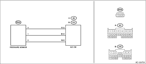 DTC DETECTING CONDITION: • Compressor was operated while refrigerant was low. • Compressor was operated while refrigerant pressure was extremely low. • Judgment is made only when the delivery mode fuse is installed. TROUBLE SYMPTOM: A/C does not operate. WIRING DIAGRAM: NOTE: For the coupling connector, refer to “WIRING SYSTEM”. Air conditioning system Air Conditioning System > WIRING DIAGRAM