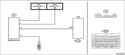 2.CHECK FUSE. 1) Turn the ignition switch to OFF. | | Replace the fuse. If the fuse blows out easily, repair the short circuit to power supply in harness between the battery and body integrated unit. | Diagnostic Procedure with Diagnostic Trouble Code (DTC) > DTC B1572 IMM CIRCUIT EXCEPT ANTENNA CIRCUIT |