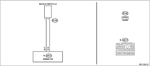 3.CHECK AIRBAG REAR HARNESS (BETWEEN AIRBAG CONTROL MODULE AND BUCKLE SWITCH) (OPEN CIRCUIT). 1) Turn the ignition switch to OFF, disconnect the battery ground terminal, and wait for 60 seconds. 2) Disconnect the connector (AB21) from seat belt pretensioner LH. 3) Disconnect the connector (AB5) from seat cushion airbag module LH. 4) Disconnect the connector (AB31) from curtain airbag module LH. 5) Disconnect the connector (AB19) of the side airbag module LH. 6) Disconnect the connectors (AB6, AB17, AB18) from airbag control module. 7) Connect the connector (1AD) in test harness AD AV to the connectors (AB6, AB17, AB18). 8) Connect the connector (2AD) in test harness AD AV and the connector (1AG) in test harness AG. 9) Disconnect the buckle switch connector (R108). 10) Measure the resistance between connector (6AG) in the test harness AG and connector (R108). CAUTION: Connect terminal (1AW) in test harness AW to connector (R108) terminal, and apply the tester to terminal (2AW). Connector & terminal (6AG) No. 17 — (R108) No. 1: (6AG) No. 2 — (R108) No. 2: | Is the resistance less than 10 -- | Diagnostic Chart with Trouble Code > DTC B1656 FRONT BUCKLE SWITCH LH FAILURE | Replace the airbag main harness along with body harness. |