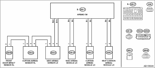 2.CHECK FRONT DOOR IMPACT SENSOR LH. 1) Turn the ignition switch to OFF, disconnect the battery ground cable, and wait for 60 seconds or more. 2) Disconnect the connector (AB58) from front door impact sensor LH. Front Door Impact Sensor > REMOVAL 3) Temporarily connect a new front door impact sensor to the connector (AB58). 4) Connect all connectors. 5) Clear the memory. Clear Memory Mode 6) Perform the Inspection Mode. Inspection Mode 7) Read the DTC. (Current malfunction) Read Diagnostic Trouble Code (DTC) | | Diagnostic Chart with Trouble Code > DTC B1698 DOOR SENSOR LH INITIALIZATION INCOMPLETE | Replace the front door impact sensor LH. Front Door Impact Sensor > REMOVAL |
