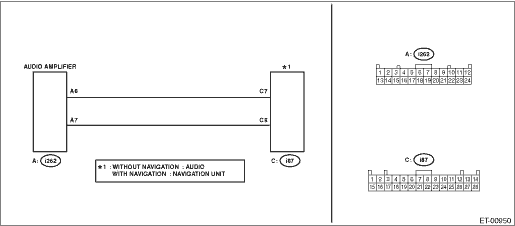 2.CHECK HARNESS (OPEN CIRCUIT). 1) Disconnect the audio (7-inch display) connector or navigation unit connector. 2) Disconnect the amplifier connector. 3) Using the tester, measure the resistance of harness between audio (7-inch display) connector or navigation unit connector and audio amplifier connector. Connector & terminal (i87) No. 7 — (i262) No. 8: (i87) No. 8 — (i262) No. 7: | Is the resistance less than 1 -- | Diagnostic Procedure with Diagnostic Trouble Code (DTC) > DTC B2244 AMPLIFIER COMMUNICATION | Repair the open circuit of harness between audio (7-inch display) connector or navigation unit connector and audio amplifier connector. |