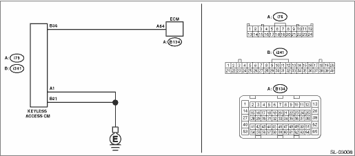 DTC DETECTING CONDITION: When input error occurs in accessory relay cut input signal of keyless access CM. TROUBLE SYMPTOM: • The accessory power supply is not cut during engine start. • Starter rotation is slow. CAUTION: For replacement procedure of keyless access CM and ECM, refer to the “REGISTRATION MANUAL FOR IMMOBILIZER” provided as a separate volume. WIRING DIAGRAM: NOTE: For the coupling connector, refer to “WIRING SYSTEM”. Keyless access with push button start system Keyless Access With Push Button Start System > WIRING DIAGRAM