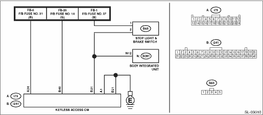 2.CHECK CURRENT DATA. Check the current data display of «Keyless access with push button start» using Subaru Select Monitor. Read Current Data «Stop light SW» | Is DTC displayed normally according to the brake pedal operation- | Diagnostic Procedure with Diagnostic Trouble Code (DTC) > DTC B2284 BRAKE SIGNAL CORRELATION | Check the stop light system. |