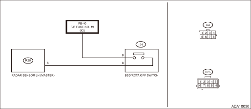 7.CHECK HARNESS (OPEN CIRCUIT). 1) Turn the ignition switch to OFF. 2) Disconnect the radar sensor LH connector. 3) Using a tester, measure the resistance between BSD/RCTA OFF switch connector and radar sensor LH connector (harness side). Connector & terminal (i94) No. 8 — (R25) No. 8: | Is the resistance less than 1 -- | Diagnostic Procedure with Diagnostic Trouble Code (DTC) > DTC B2304 REAR RADAR ON-OFF SWITCH STUCK | Repair the open circuit of harness between BSD/RCTA OFF switch and radar sensor LH. |
