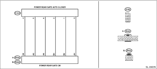 4.CHECK PRG CM (OPEN CIRCUIT). Measure the resistance between PRG CM connector and PRG auto closer connector. Connector & terminal (R422) No. 5 — (D153) No. 6: | Is the resistance 10 - or less- | Replace the PRG CM. Power Rear Gate Control Module | Repair or replace the open circuit of harness. |