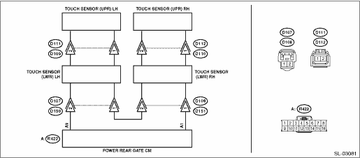 5.CHECK CONNECTOR. Check the connector of each sensor. | Is there poor contact of connector- | Replace the defective sensor. Power Rear Gate Touch Sensor | Even if DTC is displayed, the circuit has returned to a normal condition at this time. Reproduce the failure, and then perform the diagnosis again. NOTE: In this case, temporary poor contact of connector, temporary open or short circuit of harness may be the cause. |