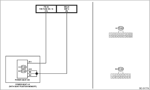 4.CHECK HARNESS. 1) Turn the ignition switch to OFF. 2) Disconnect the power seat control module connector. 3) Turn the ignition switch to ON. 4) Using the tester, measure the voltage between power seat control module connector and chassis ground. Connector & terminal (R155) No. 10 (+) — Chassis ground (−): (R155) No. 11 (+) — Chassis ground (−): (R156) No. 3 (+) — Chassis ground (−): (R156) No. 8 (+) — Chassis ground (−): | Is the voltage 8.5 — 16.5 V- | Replace the power seat control module. Power Seat System > REMOVAL | Repair the open circuit in harness between power seat control module connector and fuse. |