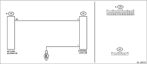 2.CHECK STEERING LOCK CM. 1) Connect the steering lock CM connector. 2) Set to ACC OFF, IGN OFF, and shift position P. 3) Using a tester, open the door, and measure the voltage between terminals of steering CM connector when the steering lock motor is driven. Connector & terminal (i47) No. 3 (+) — (i47) No. 1 (−): | Does the voltage change as follows- Steering lock motor in operation: 1 V or less > Steering lock motor not in operation: 11 — 14 V | Diagnostic Procedure with Diagnostic Trouble Code (DTC) > DTC B2782 STEERING LOCK DRIVE REQUEST SIGNAL CORRELATION | Diagnostic Procedure with Diagnostic Trouble Code (DTC) > DTC B2782 STEERING LOCK DRIVE REQUEST SIGNAL CORRELATION |