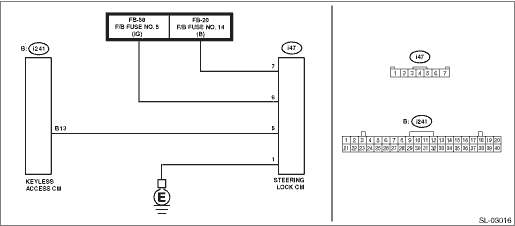 DTC DETECTING CONDITION: When mismatch occurs in the IG1 input of the steering lock CM for both LIN communication line input (IG1 input value of keyless access CM) and solid line input. TROUBLE SYMPTOM: The steering lock cannot be released. CAUTION: For replacement procedure of keyless access CM and steering lock CM, refer to the “REGISTRATION MANUAL FOR IMMOBILIZER” provided as a separate volume. WIRING DIAGRAM: NOTE: For the coupling connector, refer to “WIRING SYSTEM”. Keyless access with push button start system Keyless Access With Push Button Start System > WIRING DIAGRAM