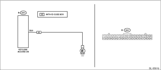 DTC DETECTING CONDITION: When the evaluation of the ID code box setting circuit via the hard wire is judged as none, ID code box communication is received. (at new registration) TROUBLE SYMPTOM: Initial registration for the access key is not possible. CAUTION: For replacement procedure of keyless access CM, refer to the “REGISTRATION MANUAL FOR IMMOBILIZER” provided as a separate volume. WIRING DIAGRAM: NOTE: For the coupling connector, refer to “WIRING SYSTEM”. Keyless access with push button start system Keyless Access With Push Button Start System > WIRING DIAGRAM