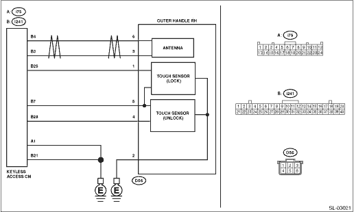 4.CHECK HARNESS (OPEN CIRCUIT). Using a tester, measure the resistance between the keyless access CM connector and front door outer handle connector, and between front door outer handle connector, keyless access CM connector and chassis ground. Connector & terminal (i241) No. 4 — (D56) No. 6: (i241) No. 3 — (D56) No. 3: (D56) No. 2 — Chassis ground: (i75) No. 1 — Chassis ground: (i241) No. 21 — Chassis ground: | Is the resistance less than 1 -- | Diagnostic Procedure with Diagnostic Trouble Code (DTC) > DTC B27A2 PASSENGER SIDE EXTERNAL ANTENNA OPEN | Repair or replace the open circuit of harness. |