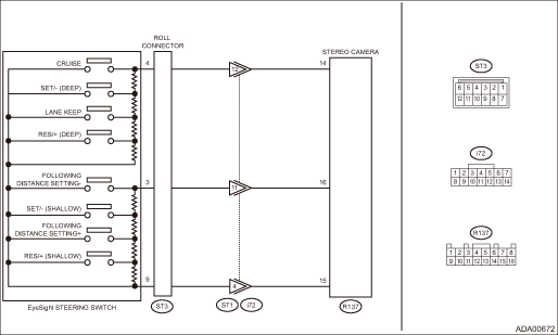 Detected when EyeSight steering switch is not installed or has malfunction, or when the harness is faulty or open-circuited or in stuck ON condition. DTC DETECTING CONDITION: • Wiring of the EyeSight steering switch is not connected. • EyeSight steering switch circuit is open. • EyeSight steering switch circuit stays ON. TROUBLE SYMPTOM: All functions of EyeSight system do not operate. WIRING DIAGRAM: EyeSight System EyeSight System > WIRING DIAGRAM