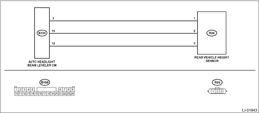 6.CHECK HARNESS (OPEN CIRCUIT). 1) Disconnect the auto headlight beam leveler CM connector. 2) Using a tester, measure the resistance between the auto headlight beam leveler CM connector and rear height sensor connector. Connector & terminal (B150) No. 3 — (R29) No. 1: (B150) No. 19 — (R29) No. 2: (B150) No. 12 — (R29) No. 3: | | Diagnostic Procedure with Diagnostic Trouble Code (DTC) > DTC B2902 REAR HEIGHT SENSOR CIRCUIT | Repair or replace the open circuit of harness. |