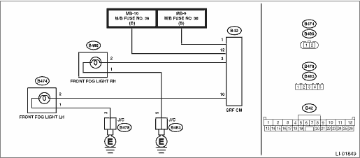 4.CHECK HARNESS (OPEN CIRCUIT). 1) Disconnect the front fog light LH connector. 2) Using a tester, measure the resistance between SRF CM connector and front fog light LH connector. Connector & terminal (B42) No. 10 — (B474) No. 2: | Is the resistance less than 1 -- | Diagnostic Procedure with Diagnostic Trouble Code (DTC) > DTC B2907 FRONT FOG LIGHT CIRCUIT LH | Repair or replace the open circuit of harness. |