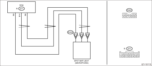 2.CHECK HARNESS (OPEN CIRCUIT). 1) Turn the ignition switch to OFF. 2) Disconnect the microphone connector. 3) Disconnect the DCM connector. 4) Measure the resistance between microphone connector and DCM connector. Connector & terminal (R353) No. 1 — (i271) No. 8: (R353) No. 4 — (i271) No. 14: (R353) No. 3 — (i271) No. 6: | Is the resistance 1 - or less- | Diagnostic Procedure with Diagnostic Trouble Code (DTC) > DTC B2A04 MIC CIRCUIT | Repair or replace the open circuit of harness. |