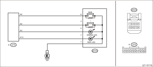 2.CHECK HARNESS (OPEN CIRCUIT). 1) Turn the ignition switch to OFF. 2) Disconnect the telematics button connector. 3) Disconnect the DCM connector. 4) Measure the resistance between telematics button connector and DCM connector. Connector & terminal (i270) No. 4 — (AD2) No. 3: (AD2) No. 1 — Chassis ground: | Is the resistance 1 - or less- | Diagnostic Procedure with Diagnostic Trouble Code (DTC) > DTC B2A09 I-CALL BUTTON CIRCUIT | Repair or replace the open circuit of harness. |