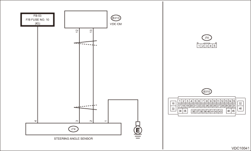 3.CHECK STEERING ANGLE SENSOR HARNESS (CHECK FOR OPEN CIRCUIT). 1) Disconnect the connector from the VDCCM&H/U. 2) Measure the resistance between VDCCM&H/U and steering angel sensor. Connector & terminal (i74) No. 2 — (B310) No. 13: (i74) No. 3 — (B310) No. 12: | Is the resistance less than 1 -- | Diagnostic Procedure with Diagnostic Trouble Code (DTC) > DTC C1711 STEERING ANGLE SENSOR | Repair the harness between the steering angle sensor and VDCCM&H/U. |