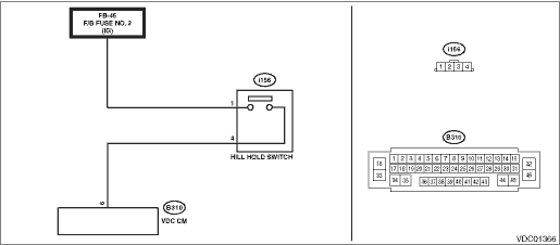 2.CHECK HARNESS (CHECK FOR OPEN CIRCUIT). 1) Turn the ignition switch to OFF. 2) Disconnect the connector from the VDCCM&H/U. 3) Measure the resistance between VDCCM&H/U and hill hold switch connector. Connector & terminal (i156) No. 4 — (B310) No. 6: | Is the resistance less than 1 -- | Diagnostic Procedure with Diagnostic Trouble Code (DTC) > DTC C1922 HILL HOLD SWITCH CIRCUIT | Repair harness and connector between VDCCM&H/U and hill hold switch connector. |