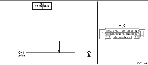 2.CHECK VDCCM&H/U GROUND CIRCUIT (CHECK FOR OPEN CIRCUIT). 1) Turn the ignition switch to OFF. 2) Measure the resistance between VDCCM&H/U connector and chassis ground. Connector & terminal (B310) No. 46 — Chassis ground: | Is the resistance less than 10 -- | Diagnostic Procedure with Diagnostic Trouble Code (DTC) > DTC C1935 IGNITION SWITCH CIRCUIT | Repair the VDCCM&H/U ground circuit. |