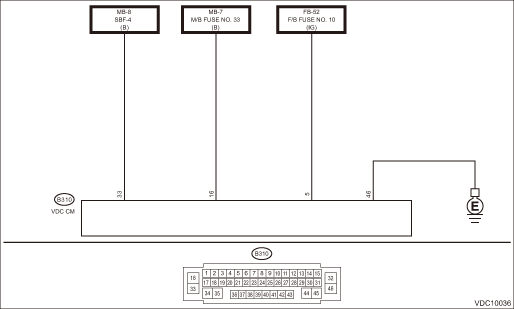 2.CHECK VDCCM&H/U GROUND CIRCUIT (CHECK FOR OPEN CIRCUIT). 1) Turn the ignition switch to OFF. 2) Disconnect the connector from the VDCCM&H/U. 3) Measure the resistance between VDCCM&H/U connector and chassis ground. Connector & terminal (B310) No. 46 — Chassis ground: | Is the resistance less than 10 -- | Diagnostic Procedure with Diagnostic Trouble Code (DTC) > DTC C1942 POWER SUPPLY VOLTAGE | Repair the VDCCM&H/U ground circuit. |