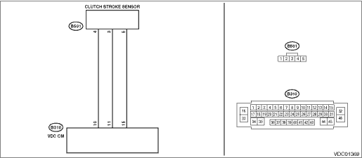 3.CHECK HARNESS (CHECK FOR OPEN CIRCUIT). 1) Turn the ignition switch to OFF. 2) Disconnect the connector from the VDCCM&H/U. 3) Measure the resistance of harness between clutch stroke sensor and VDCCM&H/U connector. Connector & terminal (B501) No. 3 — (B310) No. 11: (B501) No. 4 — (B310) No. 10: (B501) No. 5 — (B310) No. 15: | Is the resistance less than 1 -- | Diagnostic Procedure with Diagnostic Trouble Code (DTC) > DTC C1971 CLUTCH SENSOR | Repair the harness and connector between clutch stroke sensor and VDCCM&H/U connector. |