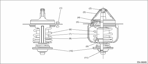 1. OUTLINE OF DIAGNOSIS Detect malfunctions of the thermostat function. Judge as NG when any one of the following conditions is established. • When the actual engine coolant temperature does not reach the maximum temperature necessary to perform other OBDII diagnosis and Σ (Estimated engine coolant temperature − actual engine coolant temperature) exceeded the predetermined value. (Judgment 1) • When the actual engine coolant temperature does not reach the range within −11°C (−19.8°F) from the regulated temperature and Σ (Estimated engine coolant temperature − actual engine coolant temperature) exceeded the predetermined value. (Judgment 2) • When the difference between the estimated coolant temperature and the actual engine coolant temperature exceeds the predetermined value, and Σ (Estimated engine coolant temperature − actual engine coolant temperature) exceeded the predetermined value. (Judgment 3) 2. COMPONENT DESCRIPTION (1) | Jiggle valve | (5) | Dust seal | (9) | Bypass spring | (2) | Piston | (6) | Main spring | (10) | Bypass valve | (3) | Flange | (7) | Wax element | (11) | Stop ring | (4) | Stop ring | (8) | Frame | | |
