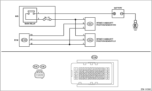 1.CHECK POWER SUPPLY OF CAMSHAFT POSITION SENSOR. 1) Turn the ignition switch to OFF. 2) Disconnect the connector from camshaft position sensor. 3) Turn the ignition switch to ON. 4) Measure the voltage between camshaft position sensor connector and engine ground. Connector & terminal (E35) No. 1 (+) — Engine ground (−): | Is the voltage 10 V or more- | Diagnostic Procedure with Diagnostic Trouble Code (DTC) > DTC P0345 CAMSHAFT POSITION SENSOR "A" CIRCUIT BANK 2 | Repair the harness and connector. NOTE: In this case, repair the following item: • Open circuit or short circuit to ground in harness between main relay connector and camshaft position sensor connector • Poor contact of coupling connector |
