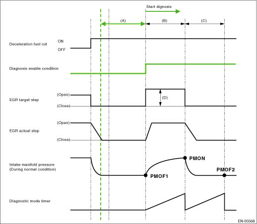 4. GENERAL DRIVING CYCLE Perform the diagnosis only once during deceleration fuel cut from a vehicle speed of 40 km/h (24.9 MPH) or more. Be careful of vehicle speed and engine speed. (Diagnosis will not be completed if the vehicle speed and engine speed conditions become out of specification due to deceleration.) 5. DIAGNOSTIC METHOD Measure the pressure values when the enable conditions are established, and perform diagnosis by calculating those results. (1) Label the intake manifold pressure value as PMOF1, which is observed when enable conditions are established, and set the EGR target step to 45 step(s) (nearly full open). (2) Label the intake manifold pressure value as PMON, which is observed after 1000 ms has passed since EGR target step was set to 45 step(s) (when the enable conditions were established), and set the EGR target step to 0. (3) Label the intake manifold pressure as PMOF2, which is observed after 1000 ms has passed since EGR target step was set to 0 (after (1000 ms + 1000 ms) have passed since the enable conditions were established). Judge as NG when the following conditions are established.
