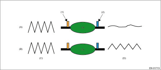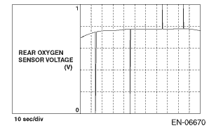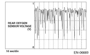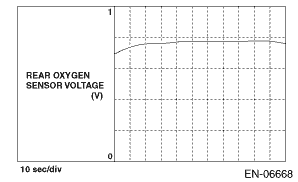 2.CHECK WAVEFORM DATA ON THE SUBARU SELECT MONITOR (WHILE DRIVING). 1) Drive at a constant speed between 80 — 112 km/h (50 — 70 MPH). 2) After 5 minutes have elapsed in the condition of step 1), use the Subaru Select Monitor while still driving to read the waveform data. • At normal condition • At abnormal condition (numerous inversion) | Is a normal waveform displayed- | Even if DTC is detected, the circuit has returned to a normal condition at this time. Reproduce the failure, and then perform the diagnosis again. NOTE: In this case, temporary poor contact of connector, temporary open or short circuit of harness may be the cause. | Diagnostic Procedure with Diagnostic Trouble Code (DTC) > DTC P0420 CATALYST SYSTEM EFFICIENCY BELOW THRESHOLD BANK 1 |