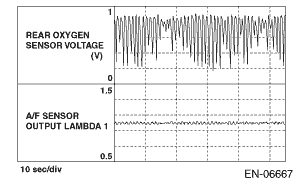 2.CHECK WAVEFORM DATA ON THE SUBARU SELECT MONITOR (WHILE DRIVING). 1) Drive at a constant speed between 80 — 112 km/h (50 — 70 MPH). 2) After 5 minutes have elapsed in the condition of step 1), use the Subaru Select Monitor while still driving to read the waveform data. • At normal condition • At abnormal condition (numerous inversion) | Is a normal waveform displayed- | Even if DTC is detected, the circuit has returned to a normal condition at this time. Reproduce the failure, and then perform the diagnosis again. NOTE: In this case, temporary poor contact of connector, temporary open or short circuit of harness may be the cause. | Diagnostic Procedure with Diagnostic Trouble Code (DTC) > DTC P0420 CATALYST SYSTEM EFFICIENCY BELOW THRESHOLD BANK 1 |