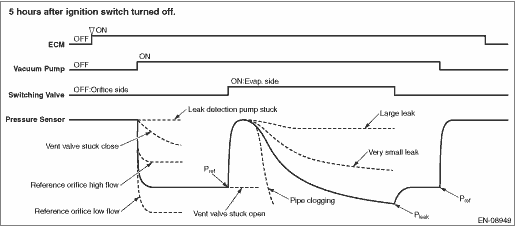 1. OUTLINE OF DIAGNOSIS This diagnosis judges whether the ELCM operation is normal or not, and whether the evaporative emission system has leak and clogging or not. To purge the canister, after driving, perform the five hours soaking after ignition switch OFF in order to stabilize the evaporative gas status. * After 5 or 7 or 9.5 hours passed, ECM is activated by soaking timer, and the leak check is started. Judges whether the ELCM operation is normal or not, by measuring the reference pressure status via reference orifice (0.02 inch orifice). Judge as malfunction if the reference pressure is out of specified range. Then, judge whether there is a leak or not, by comparing the pressure (leak pressure) when the reference pressure and the evaporative emission system are in negative pressure condition. Judge as system leak in the evaporative emission system if the leak pressure is higher than reference pressure. Judge as clogging of pipe if the leak pressure becomes lower than the reference pressure within the specified amount of time. 0.02 inch leak and 0.04 inch leak can be distinguished by measuring the leak pressure. The diagnosis results are stored inside ECM until the engine is started again. *: When the test conditions are not met in 5 hours, perform diagnosis at elapsed time of 7 hours. When the test conditions are not met in 7 hours, perform diagnosis at elapsed time of 9.5 hours. Diagnostic item | ELCM system (ELCM body) | Vacuum pump stuck Switching valve stuck to open Switching valve stuck to close Reference orifice flow large Reference orifice flow small | Leak check | Large leak • 0.04 inch leak • Fuel cap loose • Fuel cap off • System malfunction | Very small leak | Clogging of pipe | — |