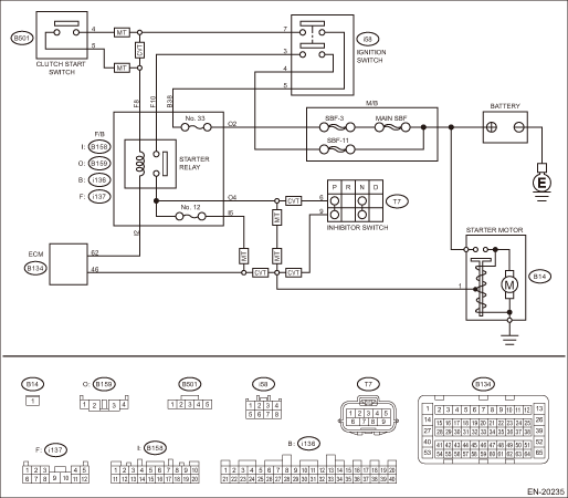 | STEP | CHECK | YES | NO | 1.CHECK STARTER MOTOR. 1) Turn the ignition to ON. 2) Check the starter motor condition. | Is the starter motor rotating- | Diagnostic Procedure with Diagnostic Trouble Code (DTC) > DTC P0617 STARTER RELAY "A" CIRCUIT HIGH | Repair the short circuit to power supply. NOTE: In this case, repair the following harnesses: • Short circuit to power supply in harness between ECM connector and starter relay connector • Short circuit to power supply in harness between ECM connector and starter motor • Short circuit to power supply in harness between starter relay connector and starter motor | 2.CHECK HARNESS BETWEEN STARTER CUT RELAY CONNECTOR AND STARTER RELAY CONNECTOR. 1) Turn the ignition to OFF. 2) Disconnect the connector from starter motor. 3) Remove the starter cut relay, starter relay and inhibitor relay. 4) Turn the ignition to ON. 5) Measure the voltage between starter relay connector and chassis ground. Connector & terminal (i137) No. 8 (+) — Chassis ground (−): | Is the voltage 10 V or more- | Repair the short circuit to power supply in harness between starter cut relay connector and starter relay connector. | Diagnostic Procedure with Diagnostic Trouble Code (DTC) > DTC P0617 STARTER RELAY "A" CIRCUIT HIGH | 3.CHECK STARTER CUT RELAY. 1) Connect the battery to starter cut relay terminals No. 17 and No. 19. 2) Measure the resistance between starter cut relay terminals. | Is the resistance 1 M- or more- | Diagnostic Procedure with Diagnostic Trouble Code (DTC) > DTC P0617 STARTER RELAY "A" CIRCUIT HIGH | Replace the starter cut relay. Relay and Fuse Diagnostic Procedure with Diagnostic Trouble Code (DTC) > DTC P0617 STARTER RELAY "A" CIRCUIT HIGH | 4.CHECK HARNESS BETWEEN ECM AND F/B STARTER RELAY CONNECTOR. 1) Disconnect the connector from ECM. 2) Measure the resistance between ECM connector and chassis ground. Connector & terminal (B134) No. 62 — Chassis ground: | Is the resistance 1 M- or more- | Diagnostic Procedure with Diagnostic Trouble Code (DTC) > DTC P0617 STARTER RELAY "A" CIRCUIT HIGH | Repair the short circuit to ground in harness between ECM connector and starter relay connector. | 5.CHECK F/B STARTER RELAY. Measure the resistance between F/B starter relay terminals. Relay and Fuse | Is the resistance 1 M- or more- | Diagnostic Procedure with Diagnostic Trouble Code (DTC) > DTC P0617 STARTER RELAY "A" CIRCUIT HIGH | Replace the starter relay. Electrical Component Location > LOCATION | 6.CHECK HARNESS BETWEEN ECM, F/B STARTER RELAY CONNECTOR AND STARTER MOTOR. 1) Disconnect the connector from ECM. 2) Turn the ignition to ON. 3) Measure the voltage between ECM connector and chassis ground. Connector & terminal (B134) No. 58 (+) — Chassis ground (−): | Is the voltage 10 V or more- | Repair the short circuit to power supply. NOTE: In this case, repair the following harnesses: • Short circuit to power supply in harness between ECM connector and starter relay connector • Short circuit to power supply in harness between ECM connector and starter motor • Short circuit to power supply in harness between starter relay connector and starter motor | Repair the poor contact of ECM connector. |